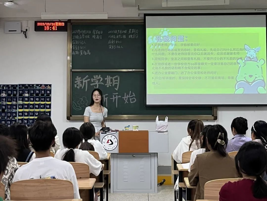 新学期第一次晚自习,学工助理为新生讲解设立早晚自习的意义,并利用晚自习时间开展讲文明、懂礼貌的主题班会,23级的新同学在学工助理的带领下看书、背单词、熟读法条,教室里学习氛围浓厚,良好的学习习惯逐渐养成。