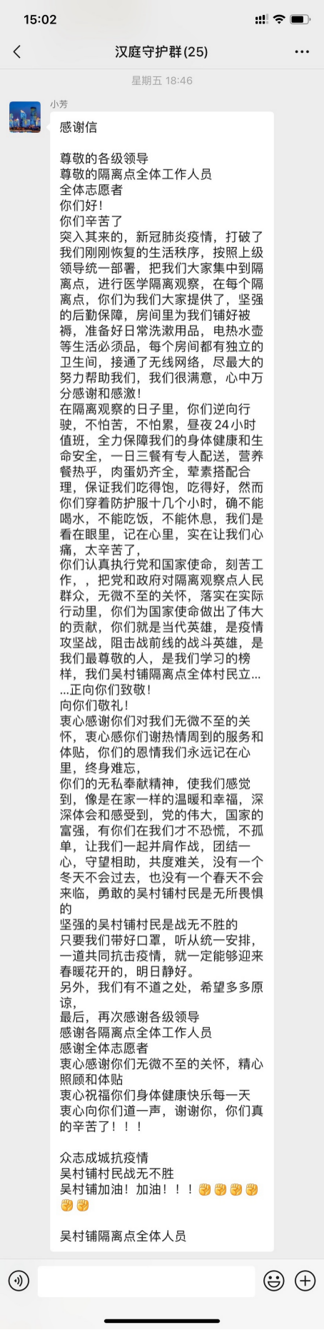 印象最深的事:印象最深的事是有一位七十多岁的老太太,很认真地听我说话,然后又很慈祥的一直在感谢我,说我们辛苦了,当时心里就暖洋洋的。还有一位隔离人员手写了一封感谢信,后来又发了电子版的感谢信,让我们都很感动。