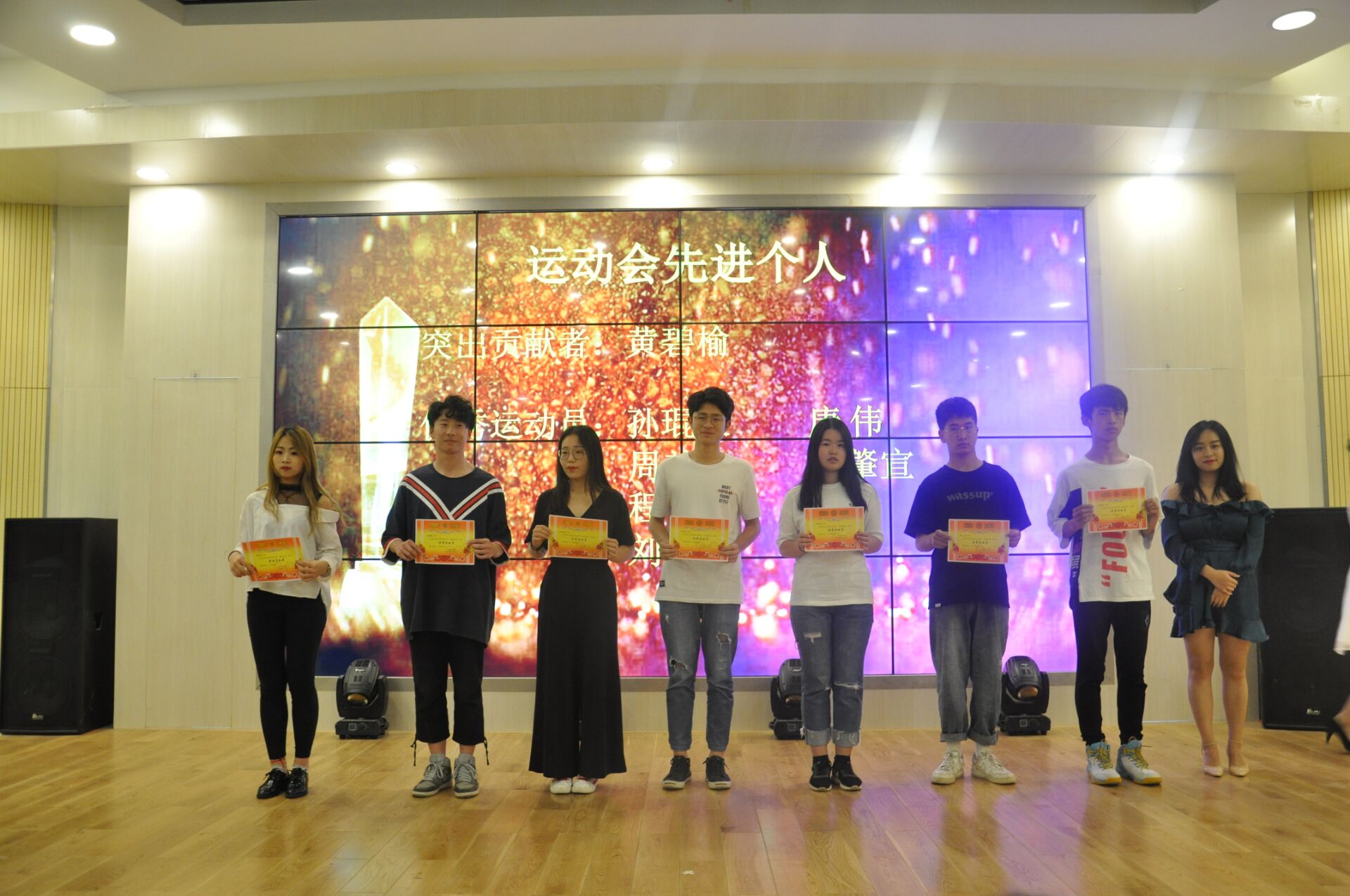 进入本次活动颁奖环节。首先表彰的是运动会先进个人,他们分别是:突出贡献者黄碧榆,优秀运动员孙琨棣、唐肇宣、周美欣等,彭思怡为他们颁奖并合影留念。然后表彰的是羽毛球赛优秀球员,他们分别是王冠文、杨博雅、王思等,由罗佳欣为他们颁奖并合影留念。接着表彰的是篮球优秀球员,女篮有夏丹薇、姜晶晶等,男篮有鲁俊江、蔡文德等,由师成峰为他们颁奖并合影留念。紧接着颁发的是篮球团队奖,男篮和女篮队长分别上台并领奖,由刘超老师为他们颁发荣誉证书及奖品,并合影留念。至此,表彰环节告一段落。在雷鸣般掌声的推动下,员工会主席程晨上台作了团学工作总结。她感谢这一年来各位部长和干事的鼓励和支持,团学因为有大家的付出更精彩!在总结过程中,她展示了本年度的活动照片,回顾了那些获得殊荣的辉煌瞬间。对于团学工作,她特别指出:工作心态很重要。良好的工作心态更能做好工作,搞好学习!她对团学的每 一位人提出希望,希望他们发扬政法的精神、扛起政法的大旗、传承政法的辉煌!