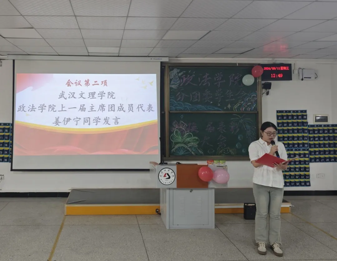 会议第二项,由bv伟德国际1946上一届主席团成员代表姜伊宁致辞。姜伊宁学姐首先总结了过去一年里bv伟德国际1946团学的工作和所取得的荣誉,并指出这些成绩的取得离不开各位员工干部的通力合作和老师们的辛勤指导。然后她详细的指出了团学各部门在过去的一年里的努力和汗水,并表示肯定和赞扬。最后,姜伊宁学姐向上一届团学干部以及老师们表达了衷心感谢,并对新一届团学干部表达了衷心祝愿。