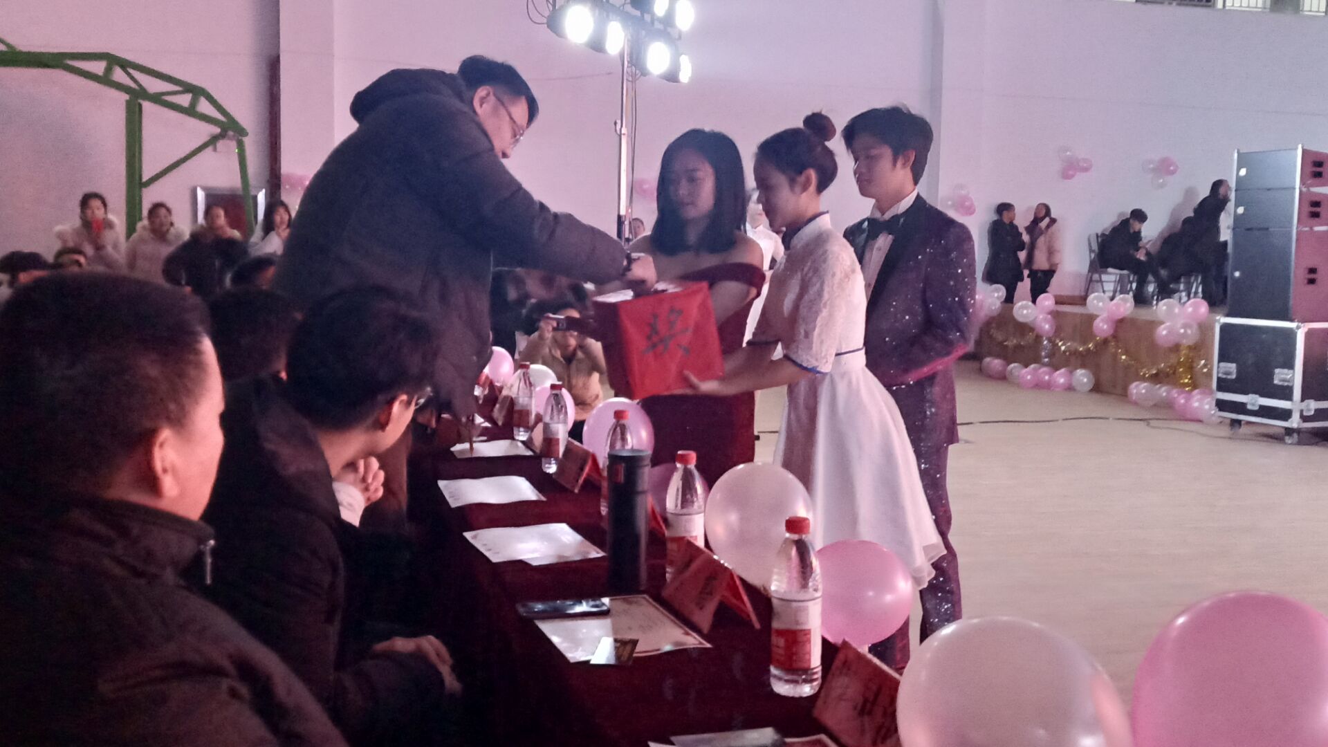 18:30晚会正式开始,元旦晚会在大屏幕上的倒计时与观众们的呼声中拉开了帷幕。随着动感的音乐响起,开场舞《Solo made in China》调起了全场气氛,一下子就吸引了在场的观众。表演的同学们用那娴熟的动作、动感的舞步感染着在场的观众。紧接着六位主持人用他们热情而又激昂的语调给晚会带来了一场精彩的开场白,并且为大家介绍了莅临此次晚会的领导嘉宾。晚会节目多彩多样,选手们多才多艺。每一个节目都有自己的特色与精彩之处。舞蹈《国师》以其强劲的舞蹈动作点燃了观众们的热情;小品《机场培训员》赢得了大家阵阵掌声;芭蕾舞《迷失芭蕾》刚一登场就引起了观众们热烈的呼声,舞蹈演员们用她们优美的舞姿和诙谐幽默的动作演绎出了与平时不同的芭蕾舞;体育公司的同学们用他们的优势来了一场肌肉秀,让观众们不得不感叹锻炼的重要性;情景剧《法海也懂爱》的演员们用幽默的表演赢得了观众们一次又一次的笑声,将晚会带入到了一个高潮;歌曲《再见青春》唱出了属于我们自己的青春;相声《你是谁》博得了观众们阵阵欢笑;歌剧《年少有为》让观众们陶醉其中;剧情走秀《倩女幽魂》让全场弥漫着浪漫而美妙的气氛;校园剧《那一夜》让大家沉浸其中;古风舞《寄明月》的表演者们用轻快的舞步,灿烂的笑容演绎不一样的青春,将晚会再次推入高潮;最后压轴节目歌舞串烧《港风80s》让整场晚会达到了最后的高潮,全场观众都不禁跟着音乐摇摆,有着意犹未尽的感觉。晚会期间还有观众们最喜爱的抽奖环节,抽到奖的同学们在新年图个好彩头,没有抽到奖的同学们以后还会有更大的奖等着你们。