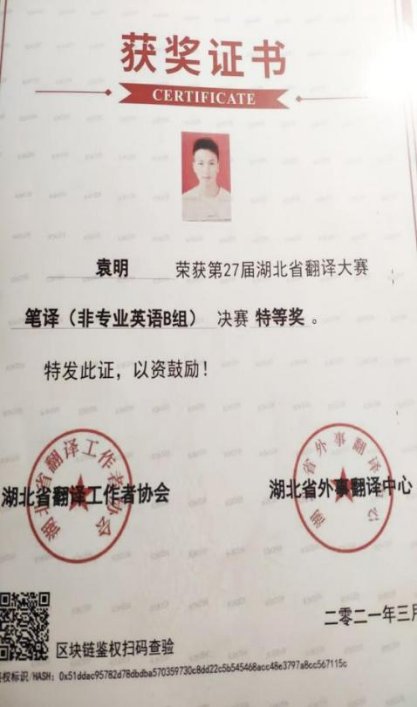 恰同学少年,风华正茂。袁明,bv伟德国际194619级法学一班,大一时曾任任bv伟德国际1946员工会外勤部干事一职,大二上学期一次性通过了老员工英语四六级考试。两年光阴,获得了商务英语证书、2021全国老员工英语辩论赛选拔赛优秀奖、全国词汇大赛优胜奖等多项证书。焚膏继晷,天道酬勤。没有横空出世的运气,只有不为人知的努力。他通过夜以继日的努力,收获了属于自己的荣誉,不久前,又斩获了湖北省翻译大赛特等奖。