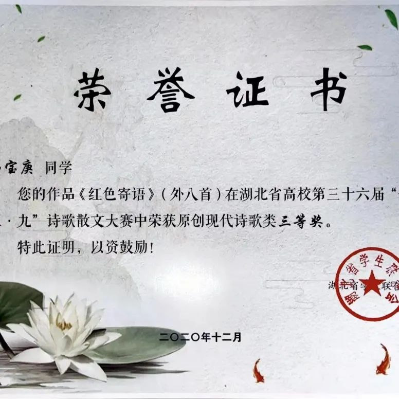 ✦湖北省“一二·九”诗歌散文大赛三等奖
