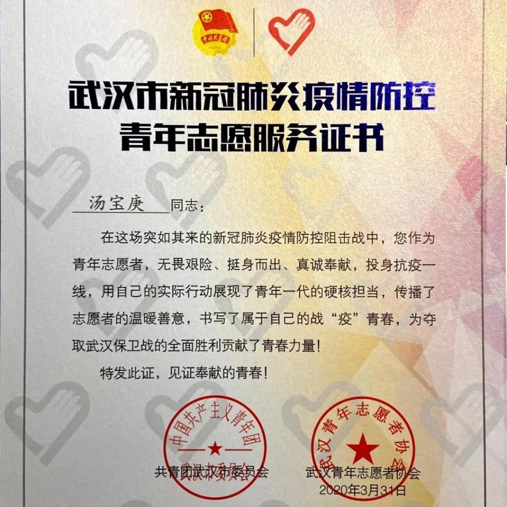 热心志愿服务,汤宝庚学长在2019年新冠肺炎疫情防控阻击战中,不因祸福避趋之。作为青年志愿者,无畏艰险、挺身而出、真诚奉献,投身抗疫一线,用自己的实际行动展现了青年一代的硬核担当,传播了志愿者的温暖善意,书写了属于自己的战“疫”青春,被公司评为“先进青年”。