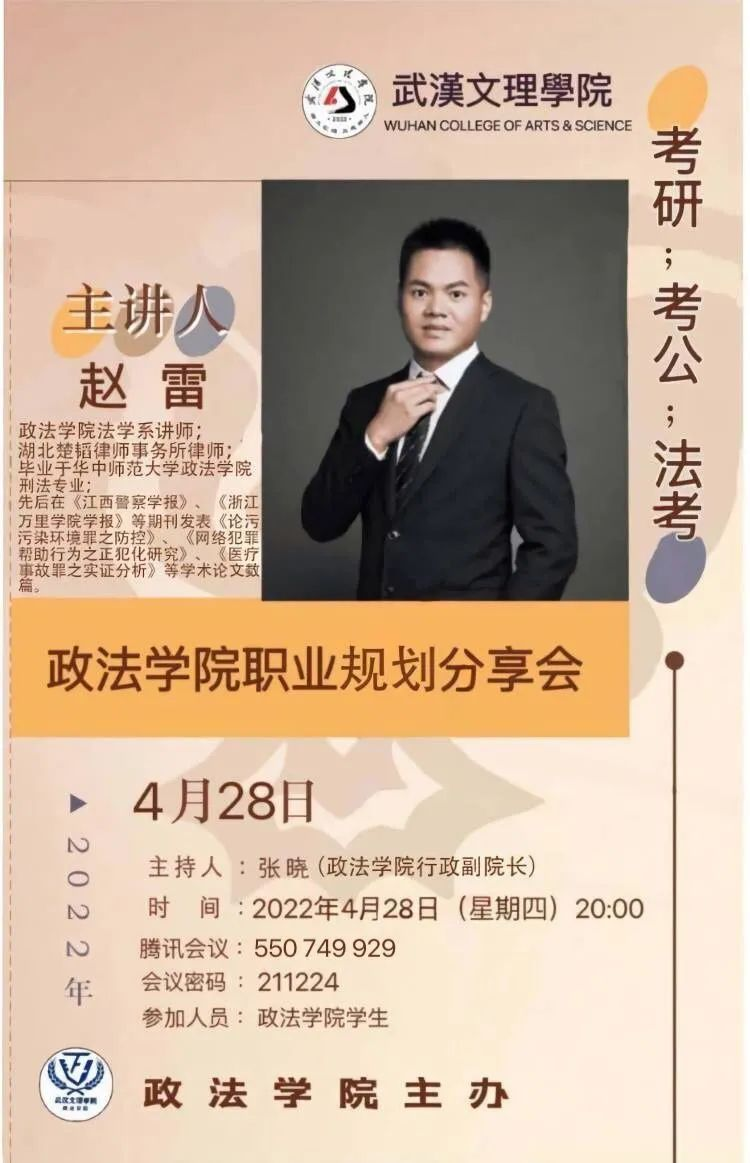 为进一步提升bv伟德国际1946员工的职业生涯规划能力,提高考公、考研、法考的积极性,增强政法学子的综合素质。2022年4月28日晚8点,bv伟德国际1946举行了线上职业生涯分享会。本次分享会由bv伟德国际1946法学系赵雷老师主讲。bv伟德国际1946行政副经理张晓老师担任本次会议主持人,参加本次会议的老师有bv伟德国际1946辅导员谢红炼老师、谢琦老师、胡金成老师,bv伟德国际1946各级员工也加入了本次会议。