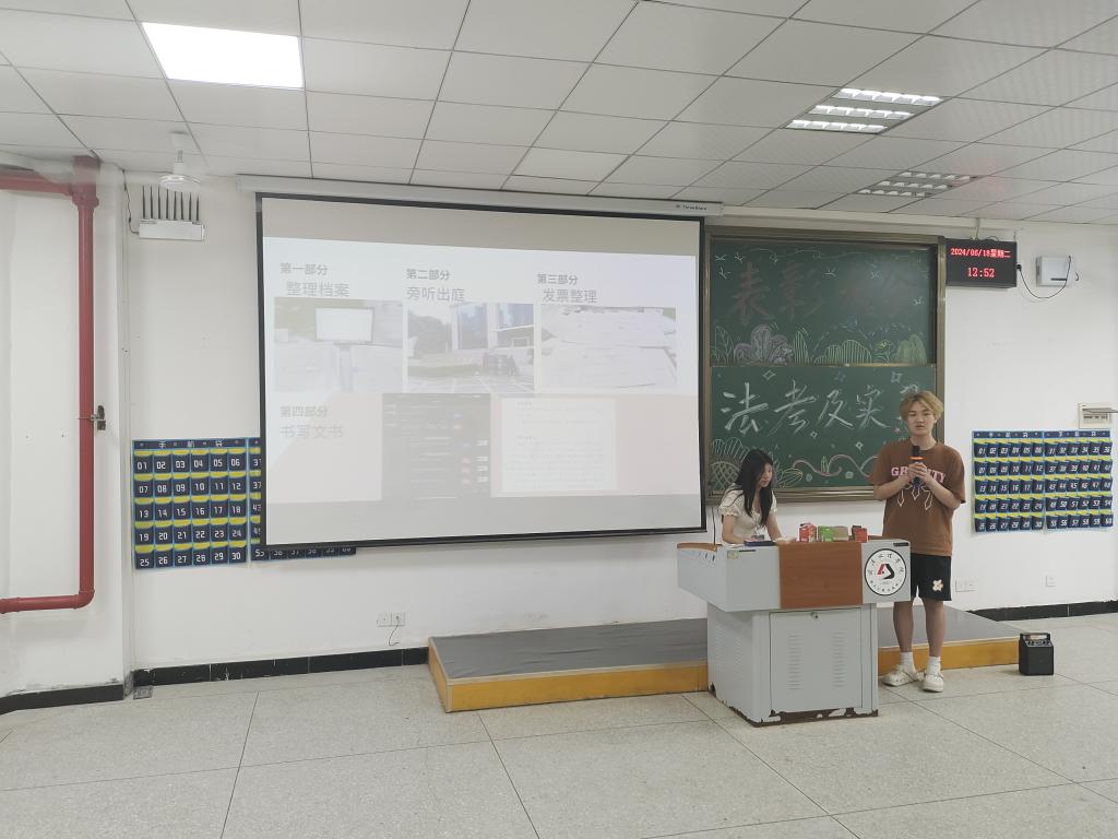 大会伊始,由20级毕业生汪硕进行了实习经验分享,他指出作为一名法员工,最好是能够去到法院和律所等与我们专业相关的地方去实习。随后,他向我们分享了他在律所实习的经历和经验,并以他自身为例简述了做好未来规划的重要性。正如“纸上得来终觉浅,绝知此事要躬行”,在实践中我们才能积累经验,不断学习处理现实中问题的方法。