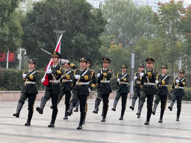 清晨第一缕阳光洒在大地上,我们注视着国旗护卫队的队员们护送着鲜艳的五星红旗向着升旗台稳步前进,他们眼神坚定、身姿挺拔,每一步都是如此的铿锵有力。