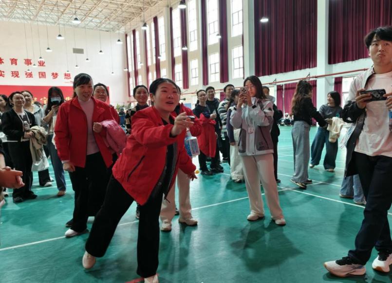 紧接着,教职工们来到了拔河赛场。两支队列紧握长绳,身体后倾、重心下沉,随着裁判哨声响起,双方瞬间发力,绳子中间的红线左右移动。场边师生组成的啦啦队,加油声一波高过一波,每一次绳子的轻微移动,都能引发全场欢呼,团队的凝聚力在这一刻被彻底点燃。