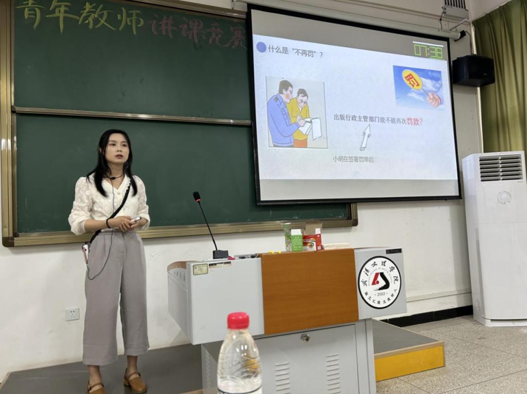 袁红艳老师则以温柔细腻的授课风格将“一事不再罚”原则娓娓道来,她遵从教学规律,由浅到深,由易到难,层层递进,图文并茂,达到了预定的教学效果,向评委们展示了多样化的法学课堂,荣获此次竞赛三等奖。